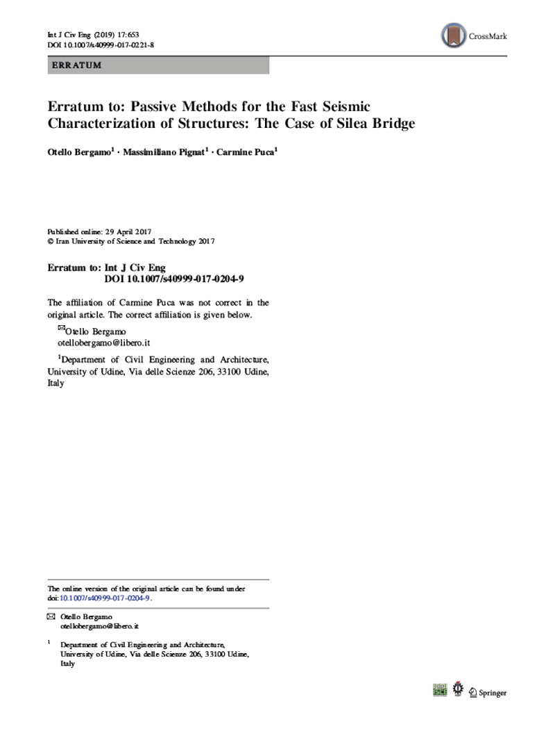 Erratum to: Passive Methods for the Fast Seismic Characterization of Structures: The Case of Silea Bridge